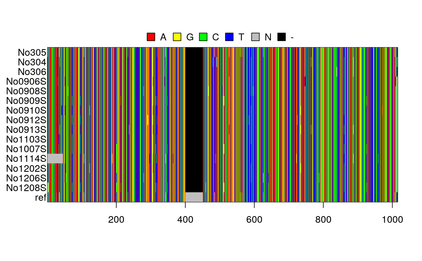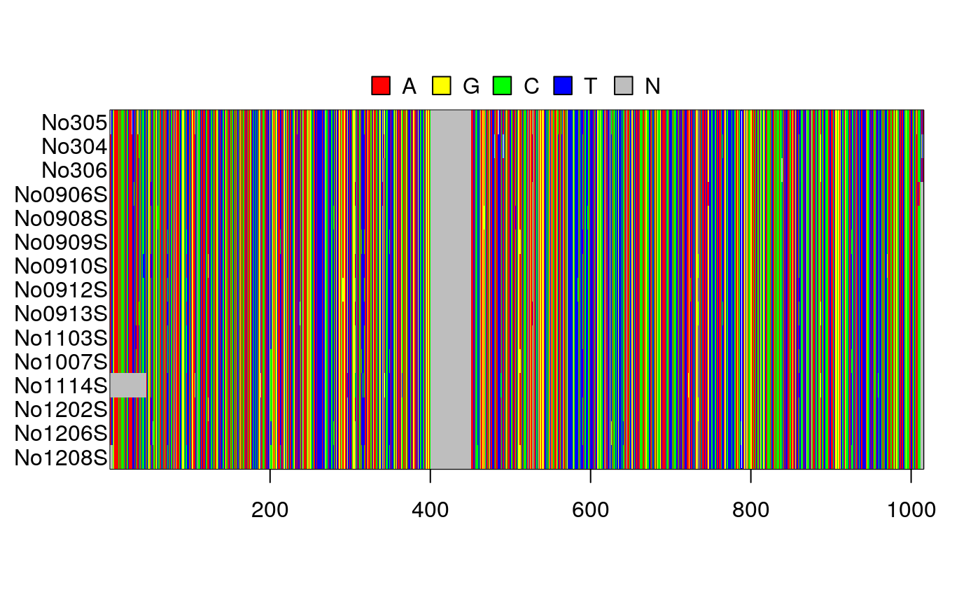 library(ape) data(woodmouse) # Make reference sequence with a 50bp intron (a string of 'n's) # in the middle. woodmouse_ref <- as.character(woodmouse[1,]) woodmouse_ref <- c(woodmouse_ref[1:400], rep("n", 50), woodmouse_ref[401:length(woodmouse_ref)]) woodmouse_ref <- as.DNAbin(woodmouse_ref) # Align with other sequences that don't include the intron. # (need to convert to list first) woodmouse_ref <- as.list(woodmouse_ref) names(woodmouse_ref) <- "ref" woodmouse <- as.list(woodmouse) woodmouse_with_introns <- ips::mafft( c(woodmouse, woodmouse_ref), path = "/usr/bin/mafft") # Image of the alignment shows that 'ref' has 'n's at positions 400-450, # while other sequences have gaps ('-'). image(woodmouse_with_introns)# Fill-in introns woodmouse_masked <- fill_introns( woodmouse_with_introns, ref_pattern = "ref" )#> #> 0 rows deleted from alignment #> 0 columns deleted from alignment# After filling-in, the reference sequence is gone and # all introns are 'n's. image(woodmouse_masked)