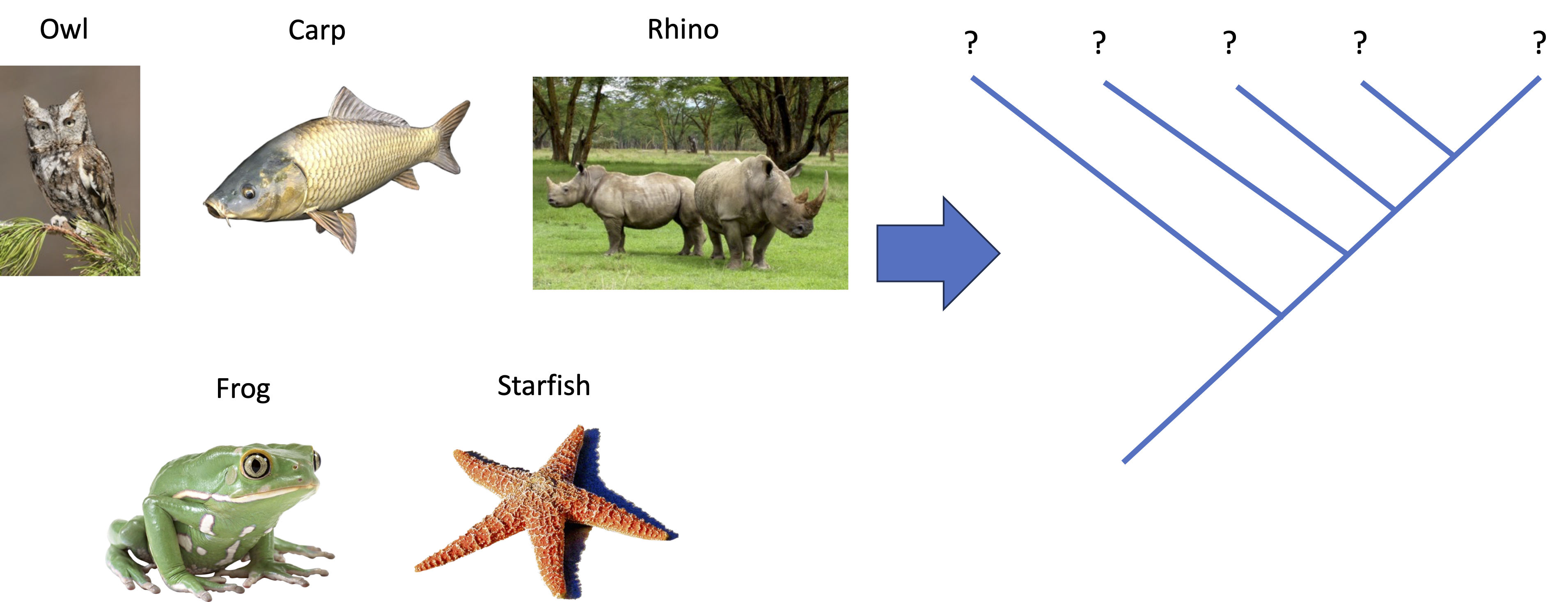 Build a phylogenetic tree including: owl, carp, rhinoceros, frog, starfish