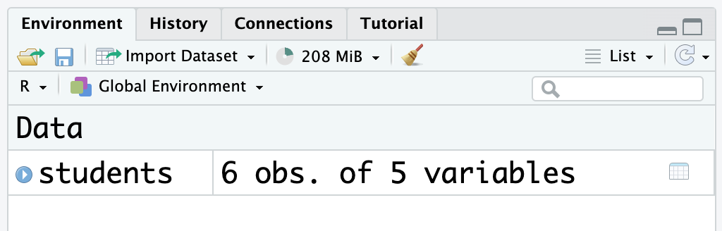 もう一つのデータの確認の仕方がある:「Environment」パネルでそのオブジェクトをクリック