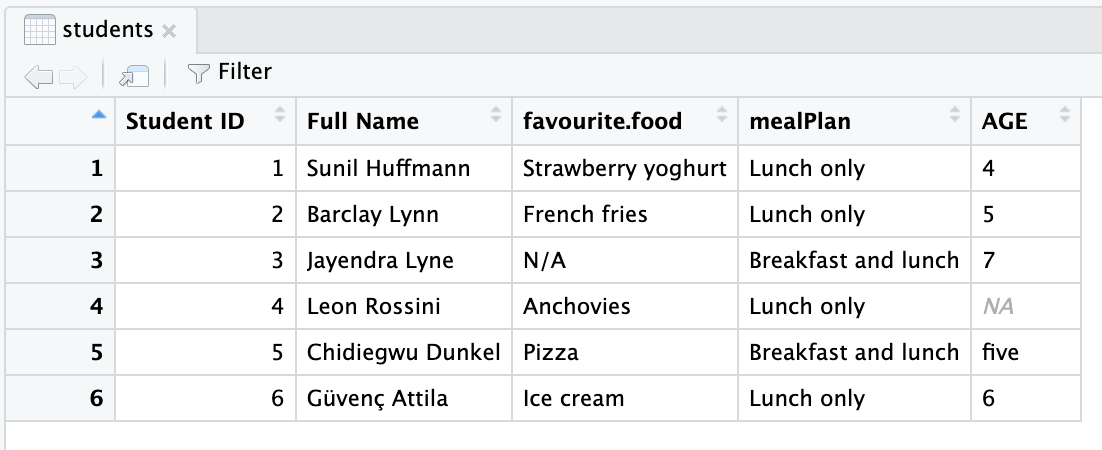 `Student ID` `Full Name` favourite.food mealPlan AGE